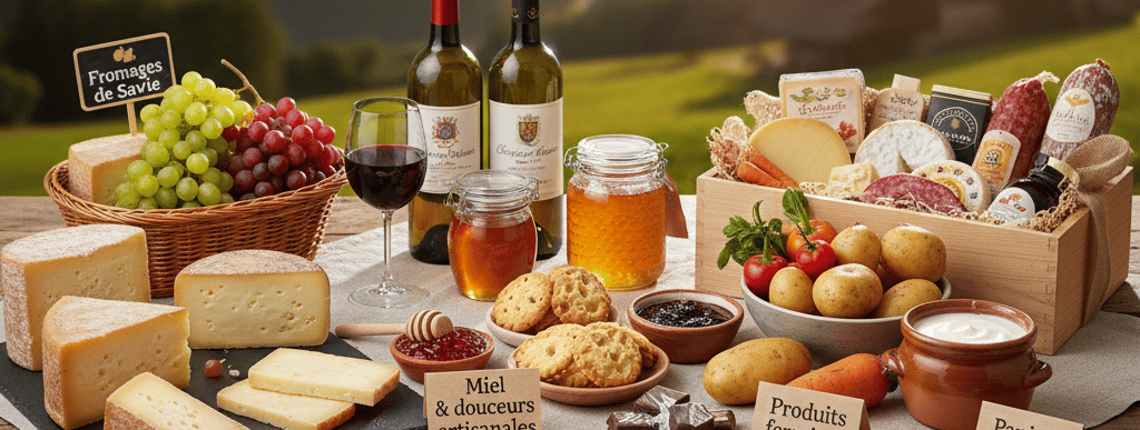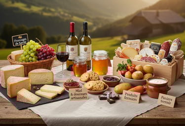 Idéal pour offrir ou découvrir la gastronomie savoyarde : fromages, vins, charcuteries et douceurs locales regroupés dans un coffret sur demande.